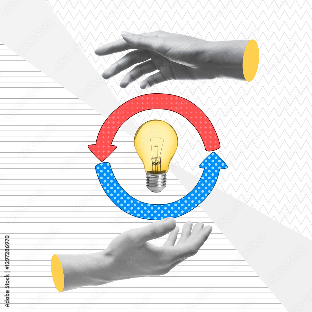 Creative art collage with glowing light bulb, arrows and people's hands on color background. Conceptual poster about idea and inspiration