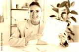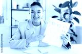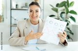 Motivated positive business woman holding a report with business data charts, proudly presenting her work and discussing important results with colleagues or client, brainstorming with business team