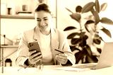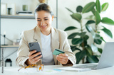 Confident successful business woman, smiling and holding a credit card and smartphone in hands while sitting at a desk in her modern office, completing online tasks, doing online payments