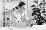 Positive busy caucasian businesswoman in a beige jacket, using her mobile phone while sitting in the office, messaging online with a client or colleague, reply to business letters, smiling