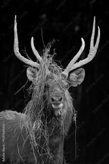 sambar deer with grass on antlers