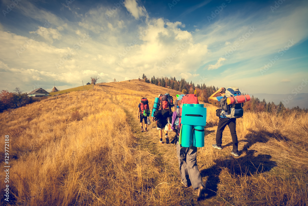 Young people are hiking in Carpathian mountains in autumn