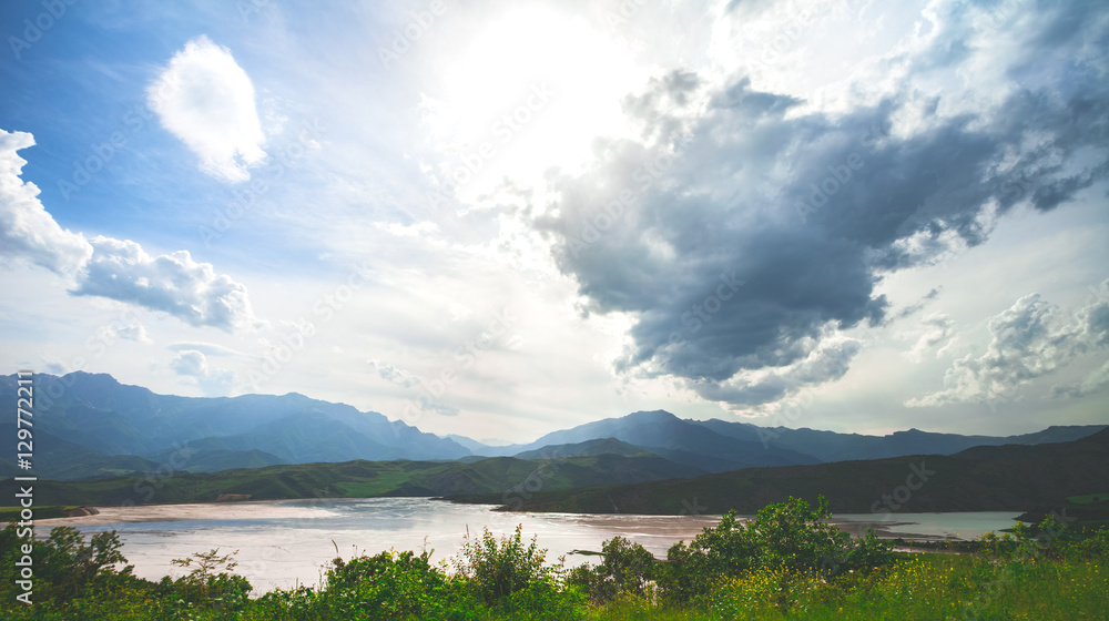 Green meadow, lake and blue sky with clouds. Exploring Armenia