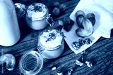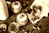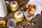 Pumpkin milkshake in glass jar with whipped cream, toffee, walnut and honey cookies. Bottle of milk. Dark wooden background. selective focus.