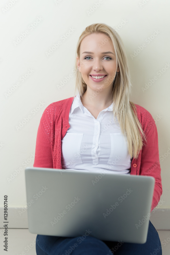 Happy young woman sitting on the floor with crossed legs and usi