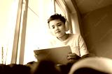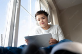 Kid Online Education,Asian Child using tablet technology for homework,Kid smiling while listening to music and playing game online with friends on internet,POV of young boy enjoying leisure activities