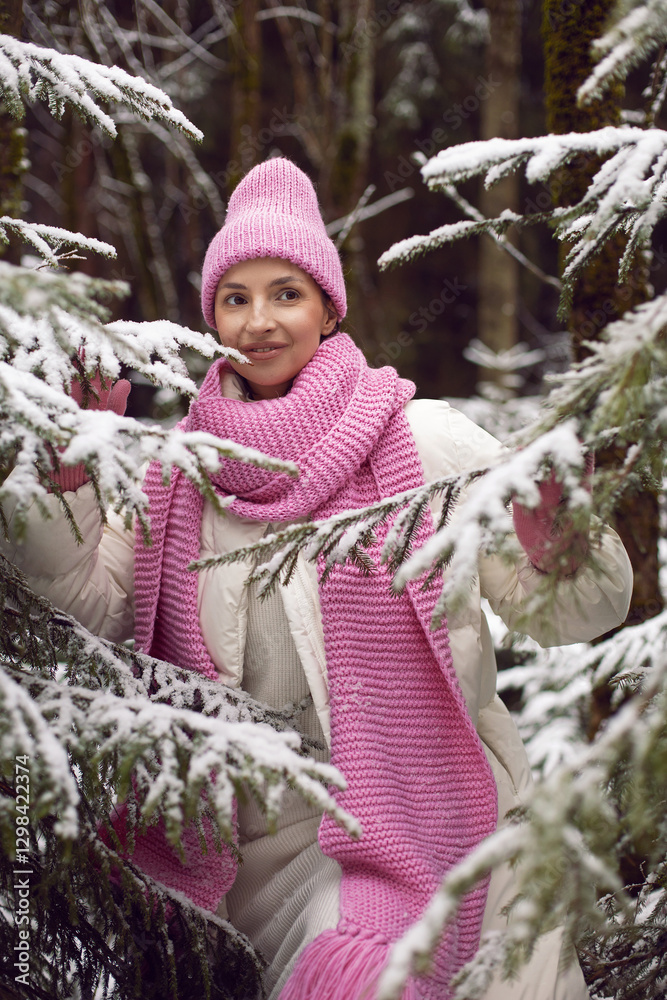 portrait of a beautiful woman in a knitted pink hat, mittens and scarf stands in the woods winter afternoon.