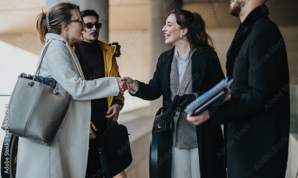 A group of young professionals engaging in a meaningful handshake during a business networking event, emphasizing collaboration, partnership, and teamwork in a modern office-like environment.