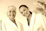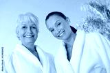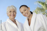 Portrait of two multiethnic women in bathrobes against blue sky at spa
