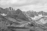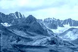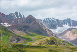 Vivid dramatic alpine scenery with green hills and rocks with view to high rocky pointy peak, sharp rockies, large snow-capped mountain top, snowy range and big glacier tongue under gray cloudy sky.