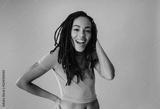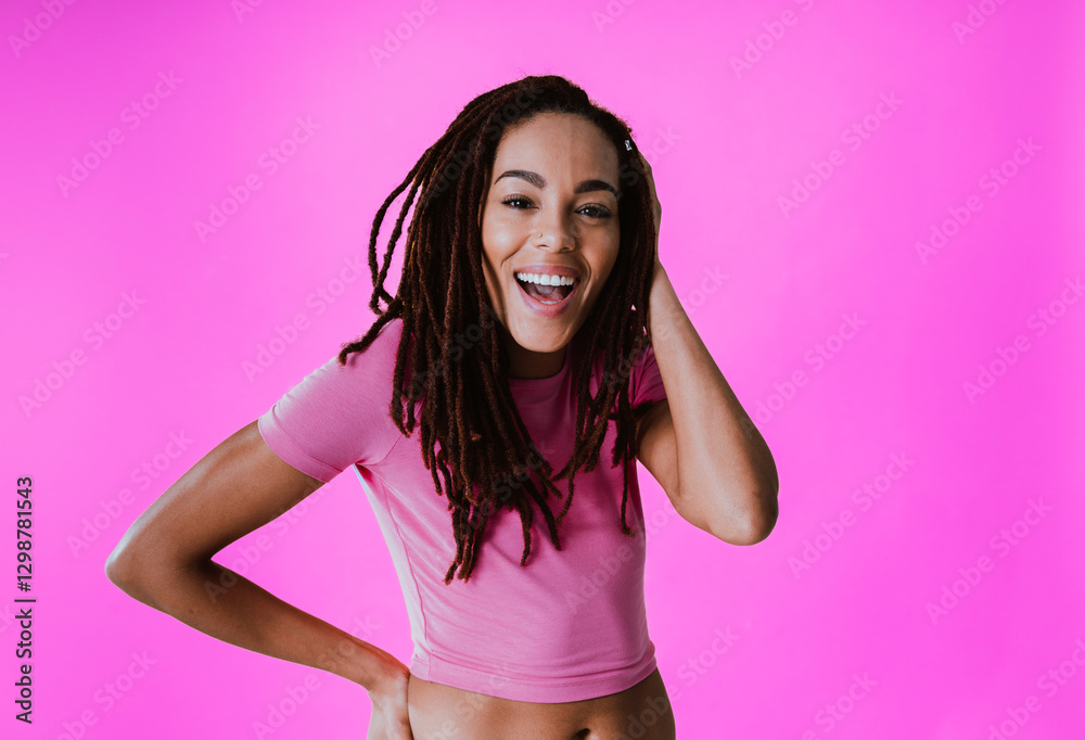 Woman posing on colored backgrounds in studio wearing trendy clothes