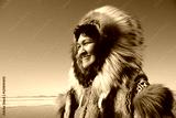 Smiling Eskimo woman wearing traditional clothing in wind against clear blue sky