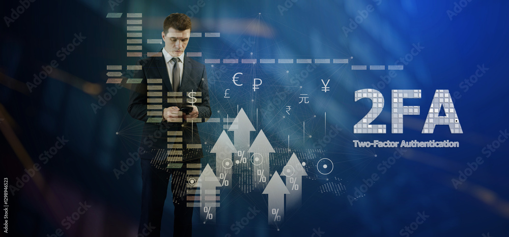 2FA. Night buildings Background A man in a business suit stands tall. He uses a mobile phone.