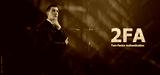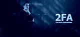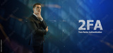 2FA. Night buildings Background A man in a business suit in a thoughtful pose. Digital flare cross