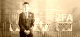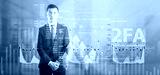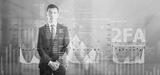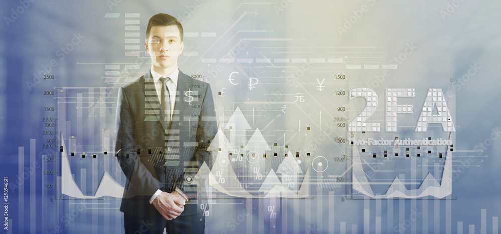 2FA. Gray light charts background. A man in a suit clasped his hands and looked around indifferently