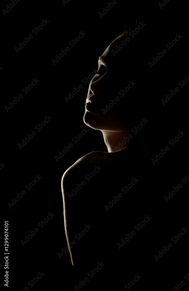 Dramatic silhouette of woman in profile. Low-key lighting highlighting contours and curves. Artistic nude photography concept with minimal background