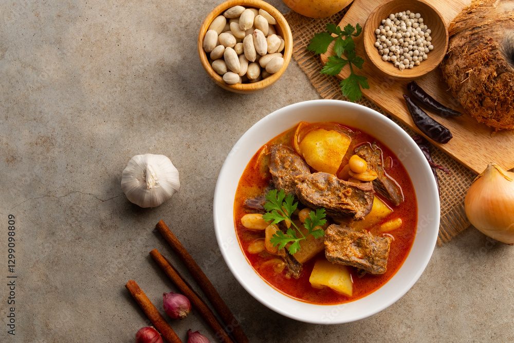 Massaman Curry with beef.Cooked beef meat and potatoes groundnut with massaman curry paste in coconut milk on white bowl.asian food.Top view.
