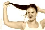 Smiling woman showing her long smooth hair in ponytail, making hairdo. Haircare concept. Studio shot, front view, isolated on white background
