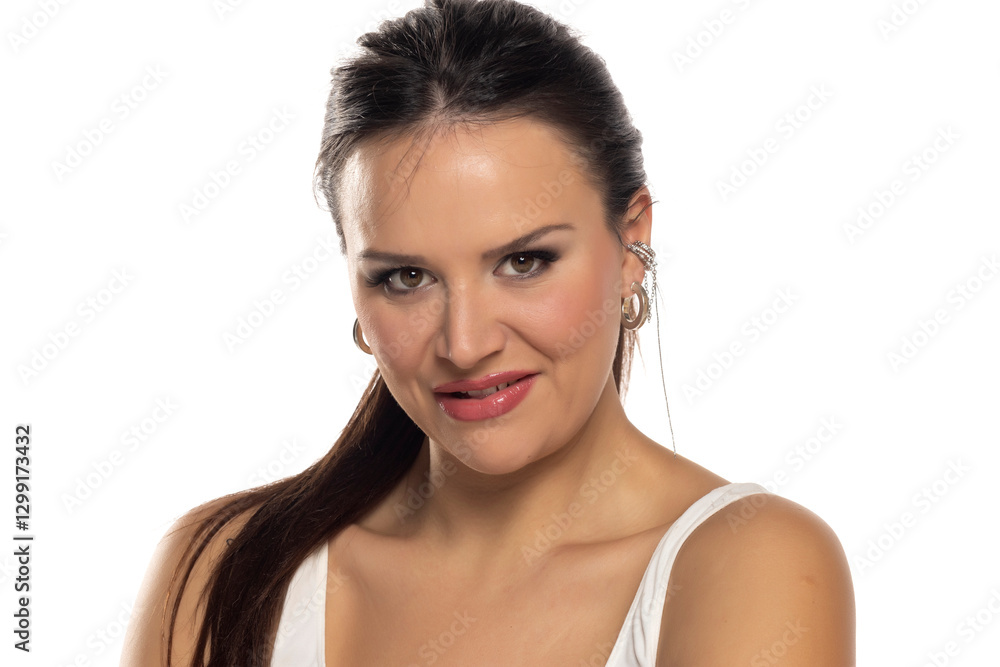 Headshot portrait of woman in 30s with makeup on a white studio background.