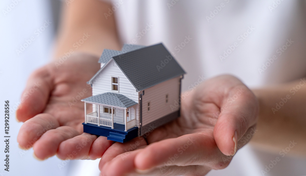 Woman holding a model of a house in her hands. The concept of buying and selling real estate