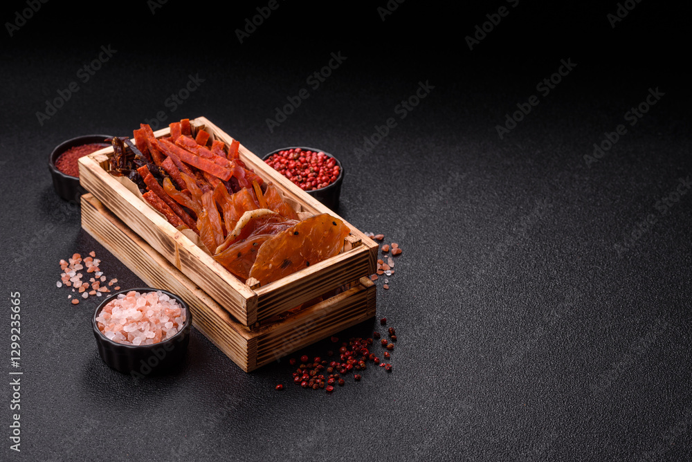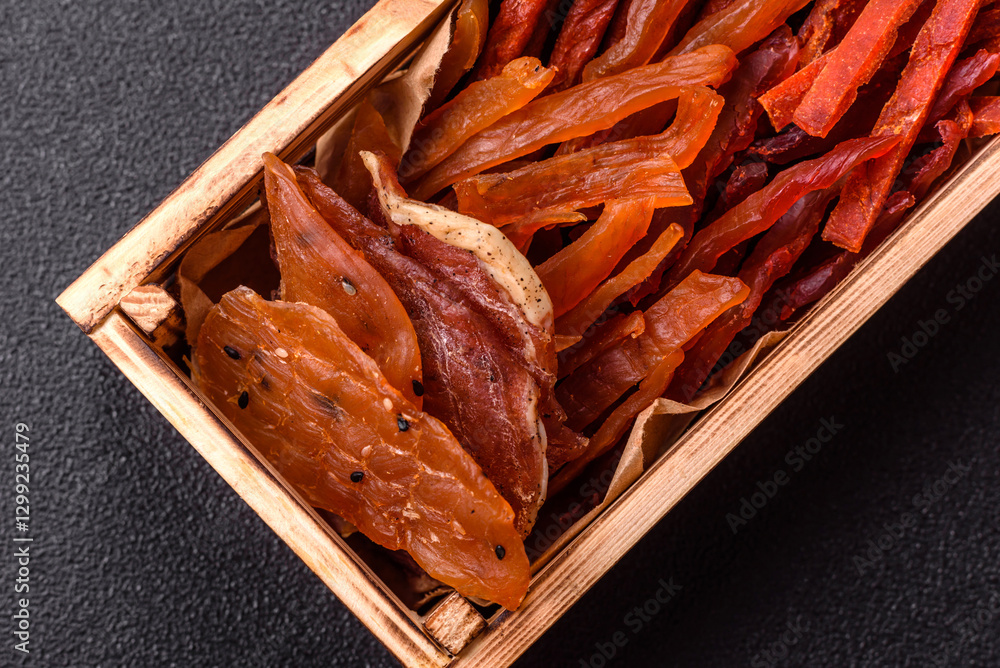 Jerky, dried fish in the form of sticks with salt, spices and herbs