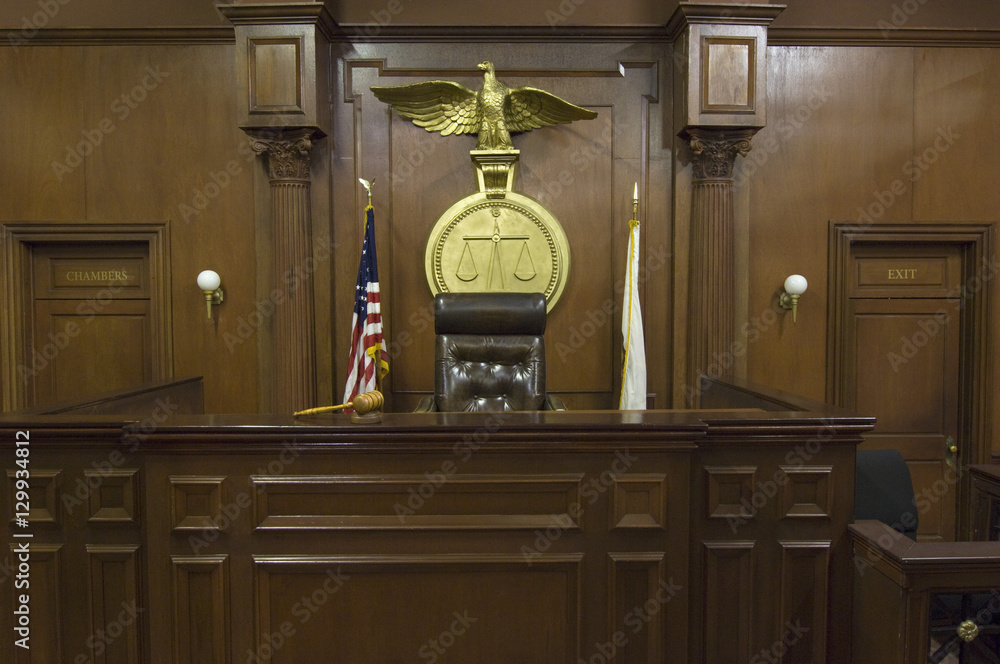 Legal scales with flags behind judge's chair in courtroom