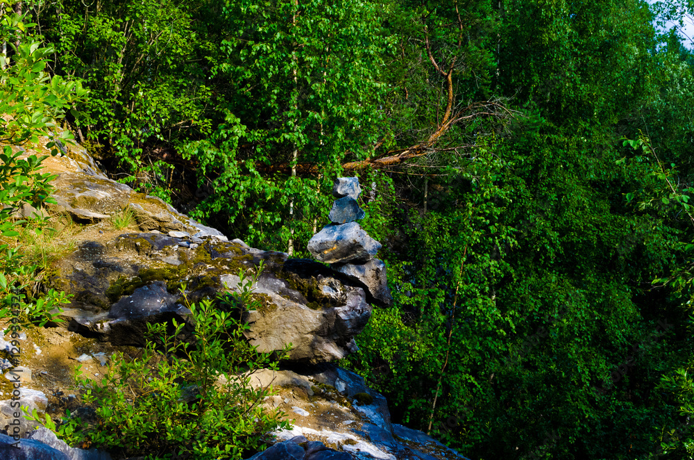 stone cliffs in a coniferous forest in summer on a sunny day