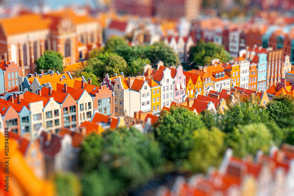 Aerial cityscape view on the old town with beautiful coorful buildings in Gdansk, Poland. Image with tilt-shift blurred effect