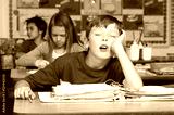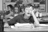 Young boy sleeping while leaning on bench with classmates in the background