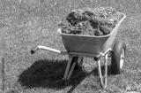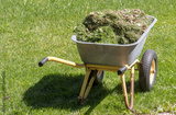 Taczka ogrodowa z trawą skoszoną przez kosiarkę, gotowa do transportu na kompost. Metalowa taczka z żółtą ramą i czarnymi uchwytami jest załadowana świeżo skoszoną trawą. .