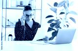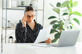 Focused serious caucasian businesswoman in a shirt and glasses, sitting at the desk with laptop in a modern office, holding document, concentrated analyzing financial report, reads business contract