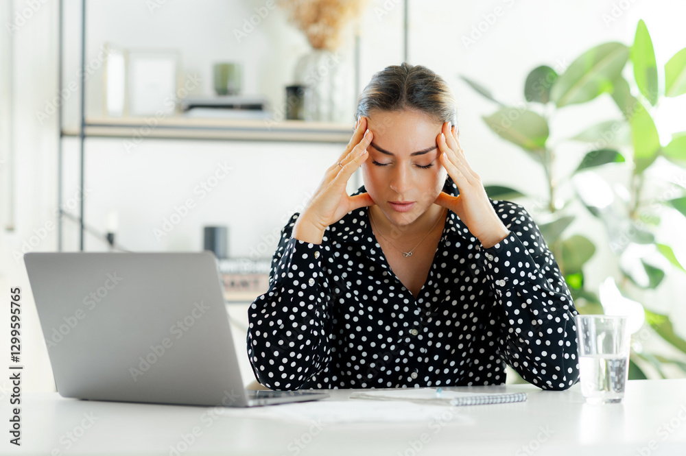 Stressed exhausted businesswoman with eyes closed, sitting at a desk with laptop, rubbing her temples with both hands, overwhelmed and tired in modern office, feels headache and overworked, need rest