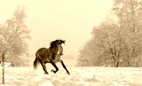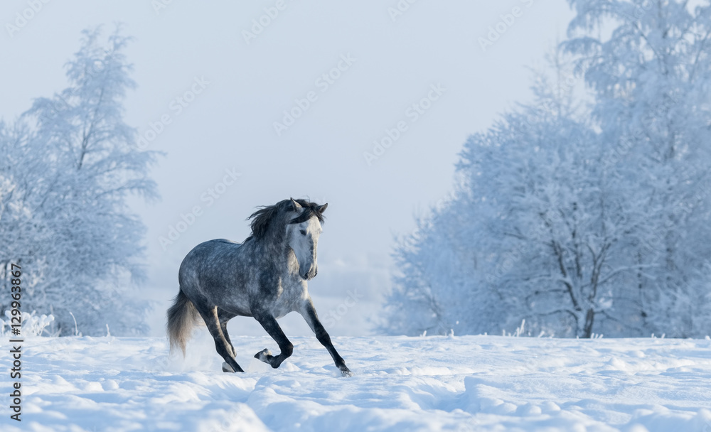 Winter snowy landscape. Galloping grey Spanish horse