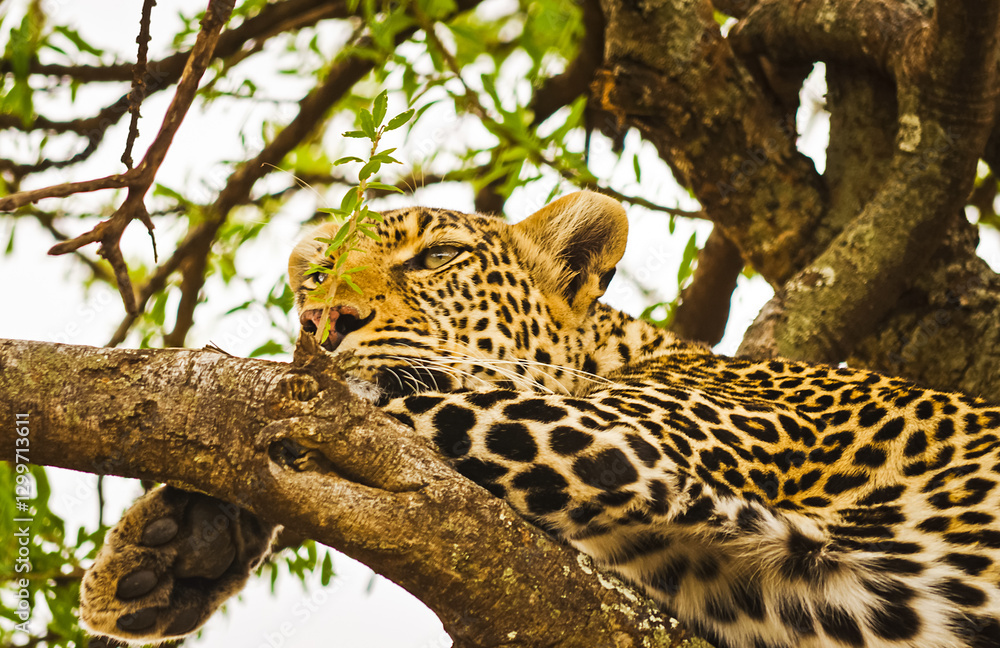 Leopard on a tree in its natural habitat in the African savannah