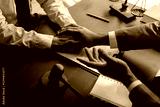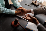 Judge gavel with Justice lawyers having team meeting at law firm background. Concepts of Law and Legal services.