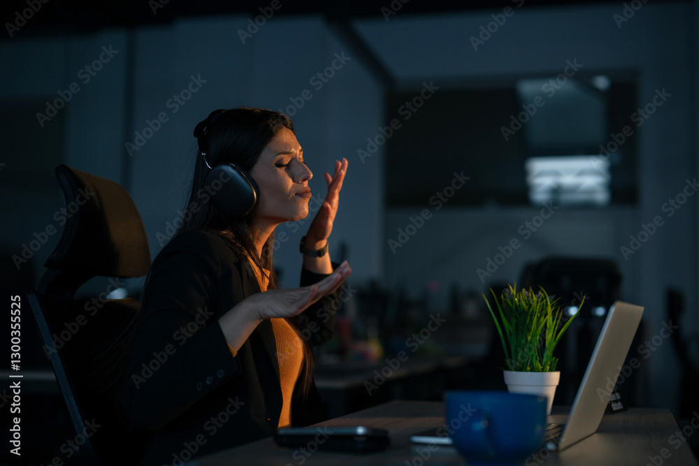 Happy Young woman in a modern office enjoying music through headphones while working late on a laptop. Concept of work-life balance, relaxation at the workplace, and music for productivity