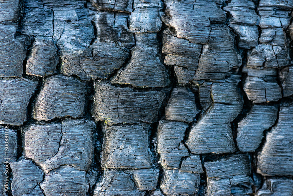 Charred Wood Texture. Close-up of charred wood with a distinctive cracked texture. Frn dark cracks and deep texture contrast.