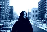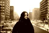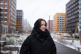 A student walks along a city street, teenage girl outdoors on a calm day, streetwear fashion with modern architecture.