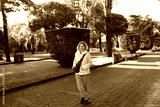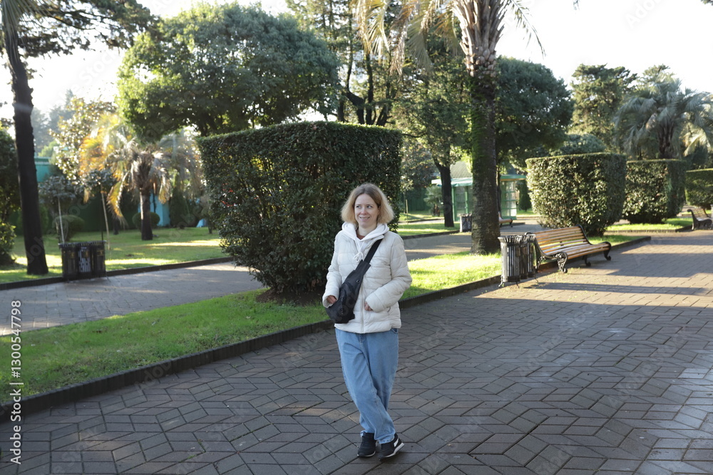 Woman in a city park, portrait of a person walking outside, street and park elements during autumn season
