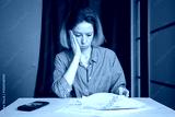 Stressed woman with debt utility bill, overdue notice and financial problem, high electricity price