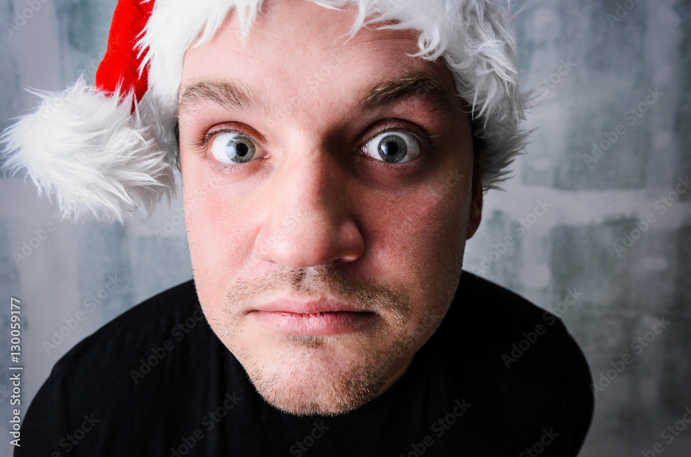 Funny Christmas celebration portrait of young adult happy man wearing Santa hat
