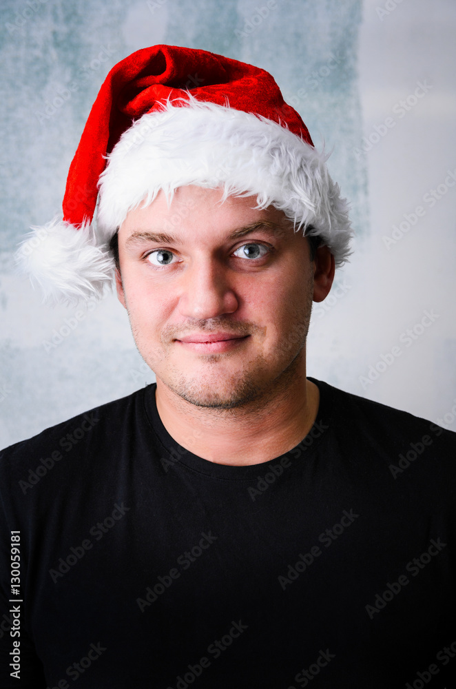 Christmas celebration portrait of young adult happy man wearing Santa hat