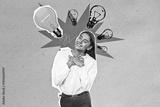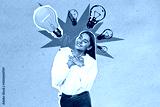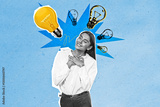 Creative businesswoman with lightbulbs symbolizing ideas.