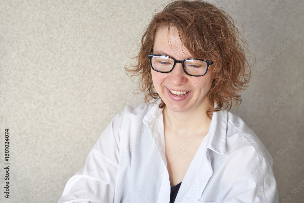 Smiling caucasian adult female with glasses and curly hair in a white shirt.