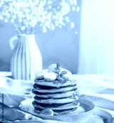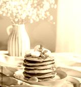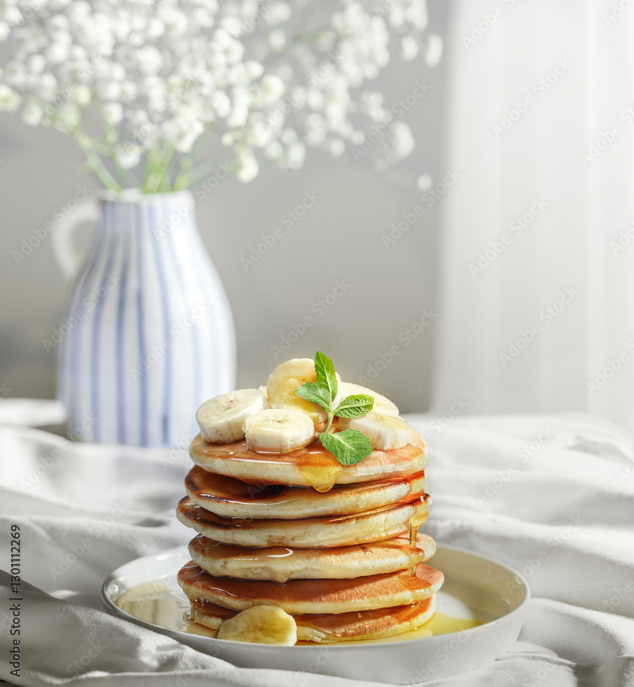 Delicious Pancakes Artfully Topped with banana slices and Golden Honey