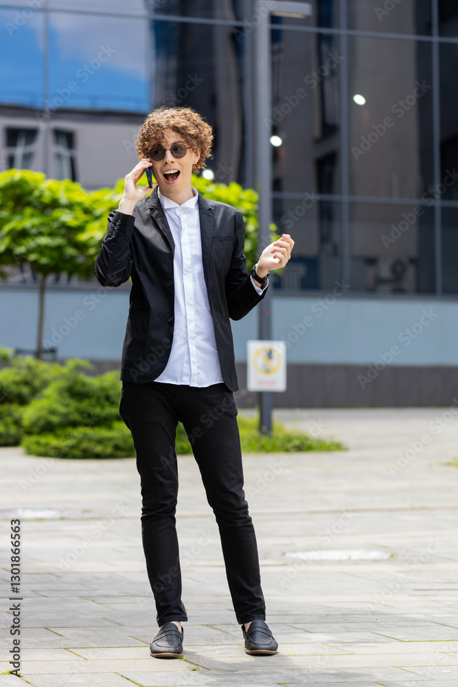 Caucasian businessman making phone call online conversation, mobile loudspeaker talking, waving hello outside office workplace. Young man in formal suit with curly hair on video call via smartphone.
