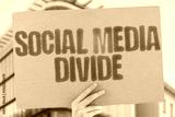 "Social media divide" on worn cardboard. Highlights escalating online societal fragmentation. CONFLICT. FRAGMENTATION. ISOLATION. ECHOCHAMBERS. MISINFORMATION. DISCOURSE. ANTAGONISM