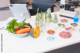 A food scientist analyzes food samples, plants, vegetables, and meat using a microscope and laboratory equipment to ensure safety, quality, and innovation in food science and technology