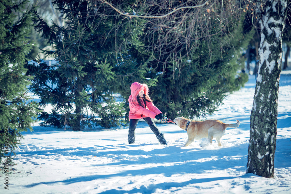 girl with a dog Labrador puppy playing in winter outdoors fun