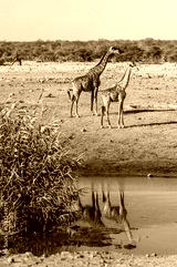 Angolan Giraffes - Giraffa giraffa angolensis standing near a waterhole in Etosha national park, Namibia.